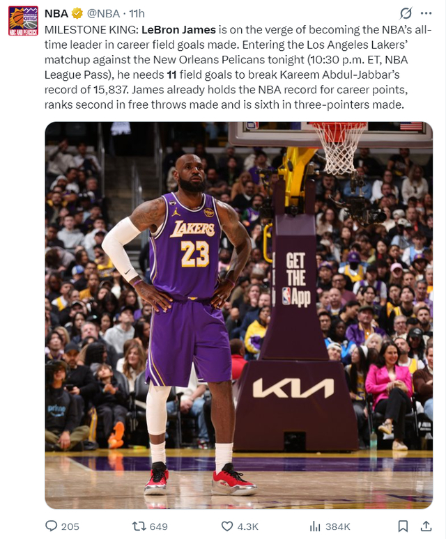 NBA官方为詹姆斯的里程碑,他还差11个运动战进球就打破贾巴尔15837个的纪录,目前詹姆斯是NBA历史总得分王,罚球命中数第二,三分命中数第六。