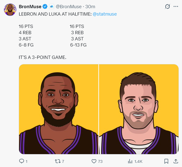 上半场打完詹姆斯8中6,三分3中1,拿到16分4篮板3助攻;东契奇半场13中6拿到16分3篮板3助攻。上半场打完湖人领先2分。